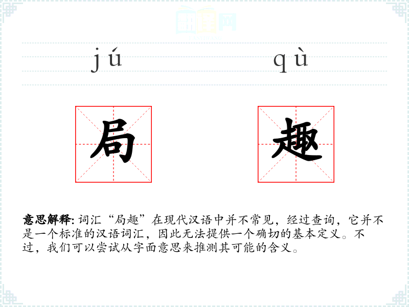词汇“局趣”在现代汉语中并不常见,经过查询,它并不是一个标准的汉语词汇,因此无法提供一个确切的基本定义。不过,我们可以尝试从字面意思来推测其可能的含义。