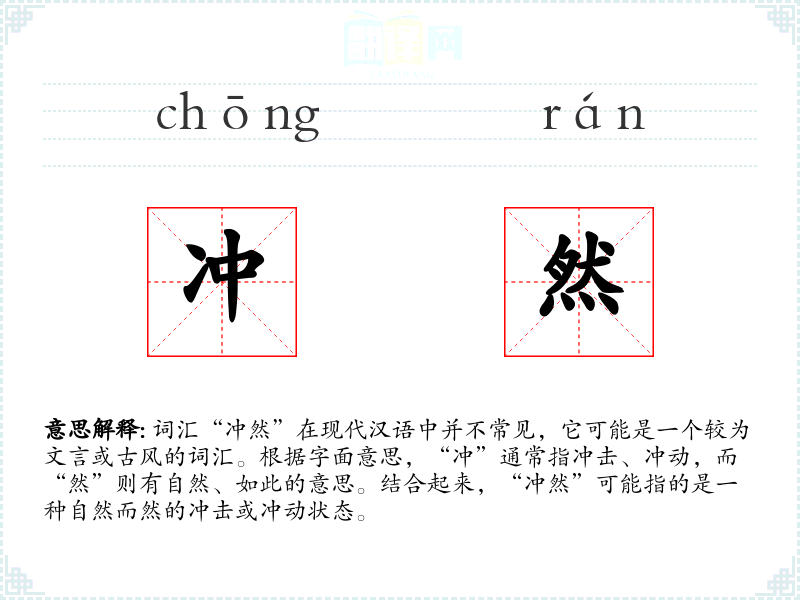 - 理解:“冲然”是一个富有历史和文化内涵的词汇,虽然在现代汉语中不常见,但在特定的文学和历史语境中仍具有重要意义。