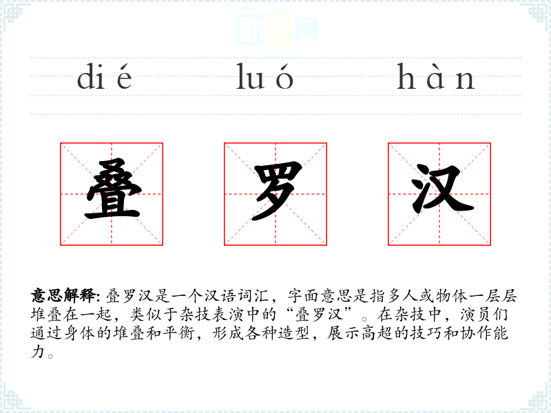叠罗汉是一个汉语词汇,字面意思是指多人或物体一层层堆叠在一起,类似于杂技表演中的“叠罗汉”。在杂技中,演员们通过身体的堆叠和平衡,形成各种造型,展示高超的技巧和协作能力。