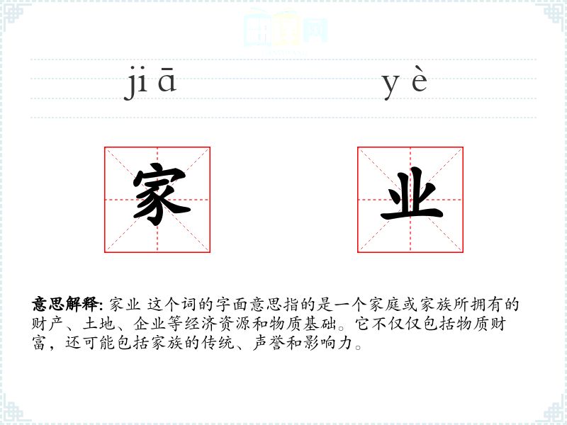 - 反义词:无(家业本身是一个正面的词汇,没有直接的反义词)