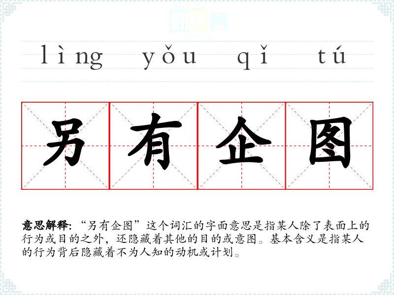 “另有企图”这个词汇的字面意思是指某人除了表面上的行为或目的之外,还隐藏着其他的目的或意图。基本含义是指某人的行为背后隐藏着不为人知的动机或计划。