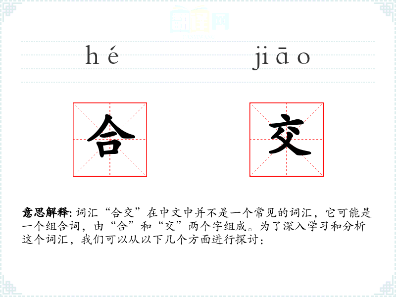 词汇“合交”在中文中并不是一个常见的词汇,它可能是一个组合词,由“合”和“交”两个字组成。为了深入学习和分析这个词汇,我们可以从以下几个方面进行探讨:
