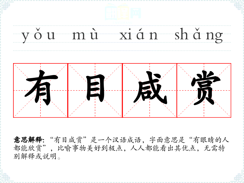 “有目咸赏”是一个汉语成语,字面意思是“有眼睛的人都能欣赏”,比喻事物美好到极点,人人都能看出其优点,无需特别解释或说明。