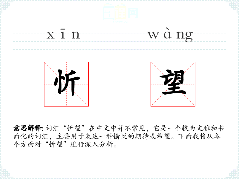 词汇“忻望”在中文中并不常见,它是一个较为文雅和书面化的词汇,主要用于表达一种愉悦的期待或希望。下面我将从各个方面对“忻望”进行深入分析。