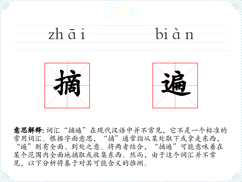 由于“摘遍”不是一个常用词汇,它在不同语言或文化中的对应词汇可能不明确。在其他语言中,可能会有类似的表达方式,用以描述全面收集或摘取的行为。