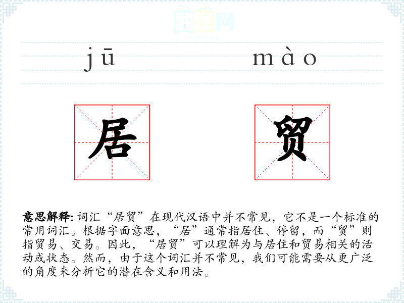 词汇“居贸”在现代汉语中并不常见,它不是一个标准的常用词汇。根据字面意思,“居”通常指居住、停留,而“贸”则指贸易、交易。因此,“居贸”可以理解为与居住和贸易相关的活动或状态。然而,由于这个词汇并不常见,我们可能需要从更广泛的角度来分析它的潜在含义和用法。
