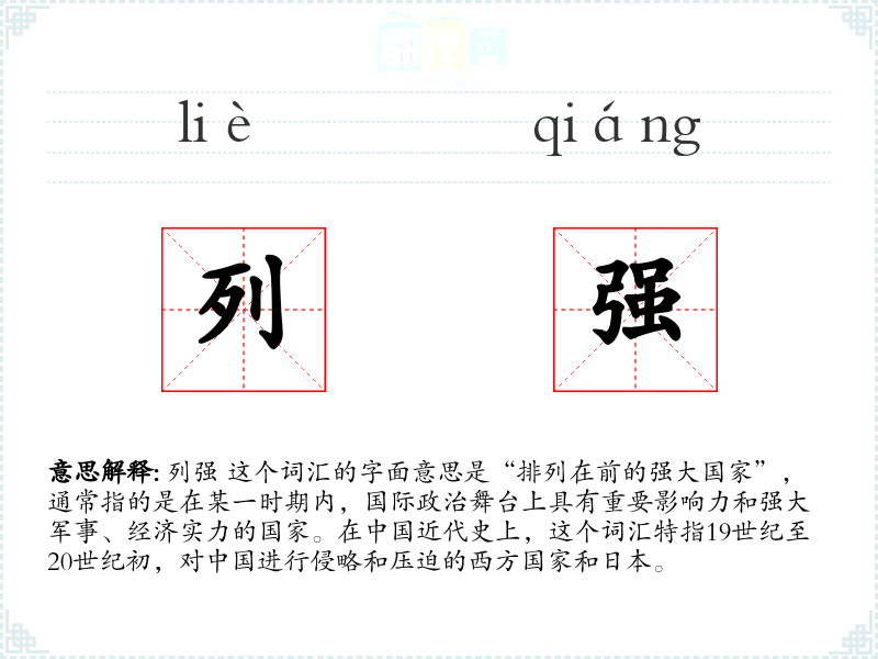 列强 这个词汇的字面意思是“排列在前的强大国家”,通常指的是在某一时期内,国际政治舞台上具有重要影响力和强大军事、经济实力的国家。在近代史上,这个词汇特指19世纪至20世纪初,对进行侵略和压迫的西方国家和日本。