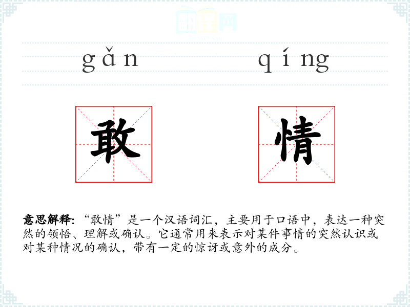 “敢情”是一个汉语词汇,主要用于口语中,表达一种突然的领悟、理解或确认。它通常用来表示对某件事情的突然认识或对某种情况的确认,带有一定的惊讶或意外的成分。