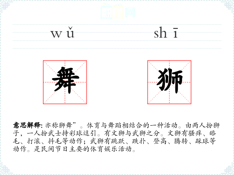 1.亦称狮舞”。体育与舞蹈相结合的一种活动。由两人扮狮子,一人扮武士持彩球逗引。有文狮与武狮之分。文狮有骚痒、舔毛、打滚、抖毛等动作;武狮有跳跃、跌扑、登高、腾转、踩球等动作。是民间节日主要的体育娱乐活动。