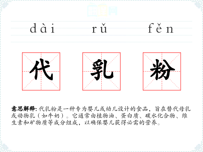- 反义词:母乳(代乳粉的天然替代品)