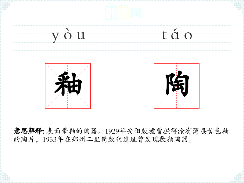 表面带釉的陶器。1929年安阳殷墟曾掘得涂有薄层黄色釉的陶片,1953年在郑州二里岗殷代遗址曾发现敷釉陶器。