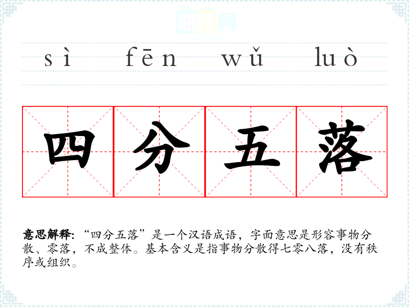 “四分五落”是一个汉语成语,字面意思是形容事物分散、零落,不成整体。基本含义是指事物分散得七零八落,没有秩序或组织。