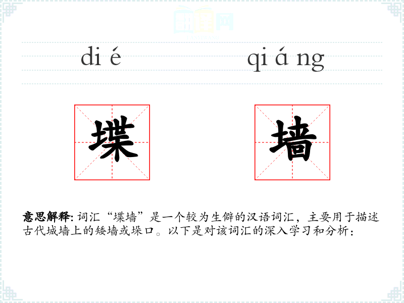 词汇“堞墙”是一个较为生僻的汉语词汇,主要用于描述古代城墙上的矮墙或垛口。以下是对该词汇的深入学*和分析: