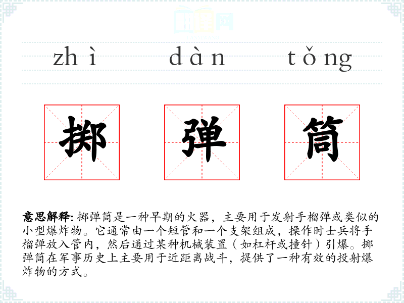 同义词:手榴弹发射器、榴弹发射器 反义词:狙击步枪(用于远距离精确射击,与掷弹筒的近距离爆炸作用形成对比)