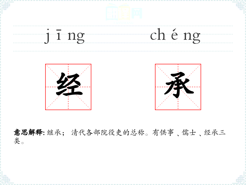 继承; 清代各部院役吏的总称。有供事﹑儒士﹑经承三类。
