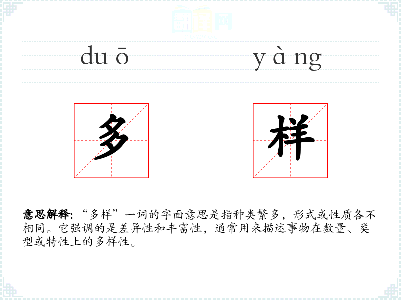 “多样”一词的字面意思是指种类繁多,形式或性质各不相同。它强调的是差异性和丰富性,通常用来描述事物在数量、类型或特性上的多样性。