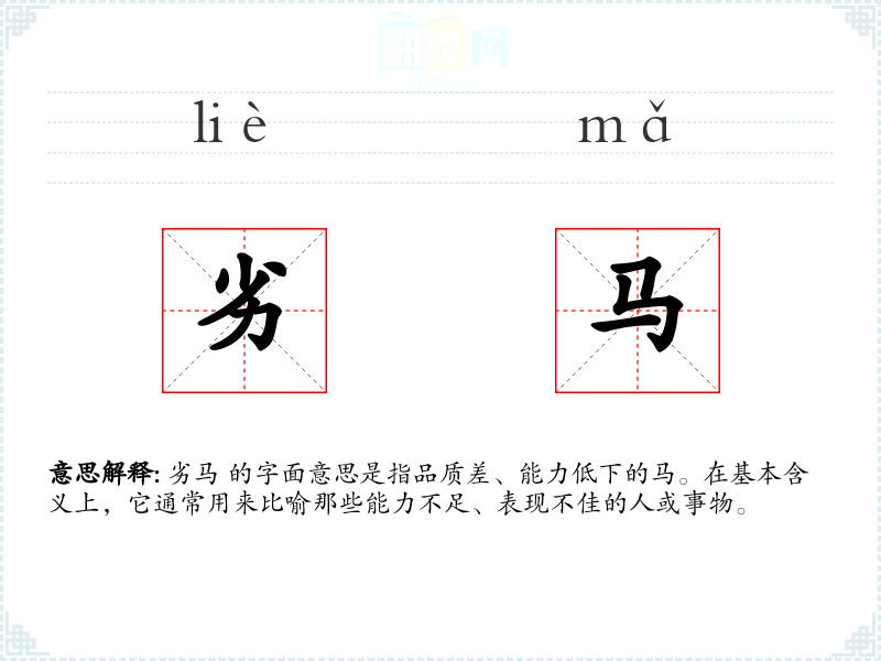 劣马 的字面意思是指品质差、能力低下的马。在基本含义上,它通常用来比喻那些能力不足、表现不佳的人或事物。