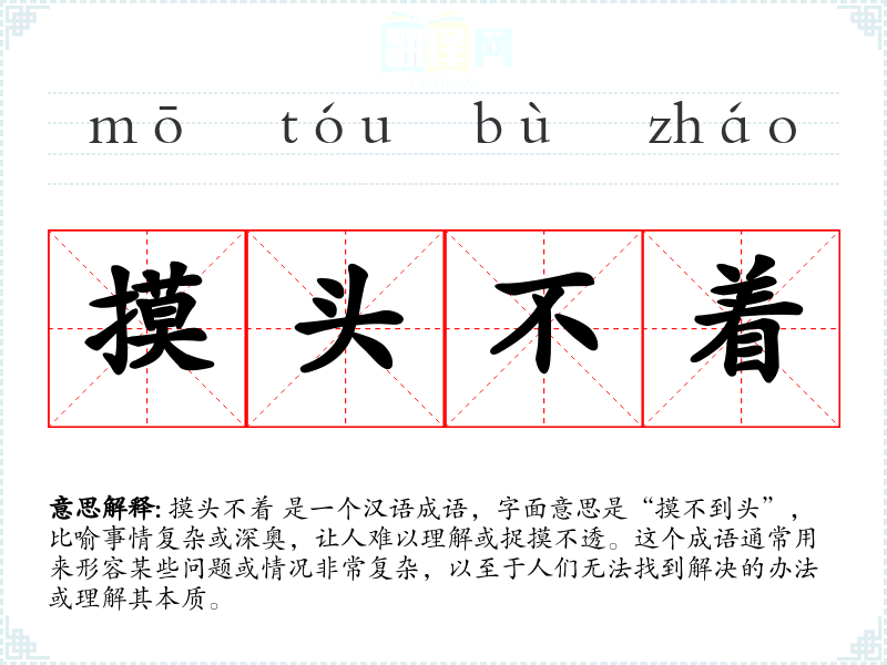摸头不着 是一个汉语成语,字面意思是“摸不到头”,比喻事情复杂或深奥,让人难以理解或捉摸不透。这个成语通常用来形容某些问题或情况非常复杂,以至于人们无法找到解决的办法或理解其本质。