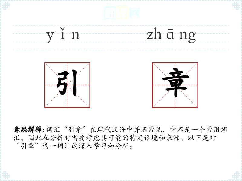 词汇“引章”在现代汉语中并不常见,它不是一个常用词汇,因此在分析时需要考虑其可能的特定语境和来源。以下是对“引章”这一词汇的深入学*和分析: