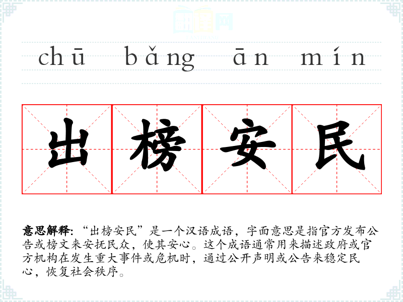 “出榜安民”是一个汉语成语,字面意思是指官方发布公告或榜文来安抚民众,使其安心。这个成语通常用来描述政府或官方机构在发生重大**或危机时,通过公开声明或公告来稳定民心,恢复社会秩序。