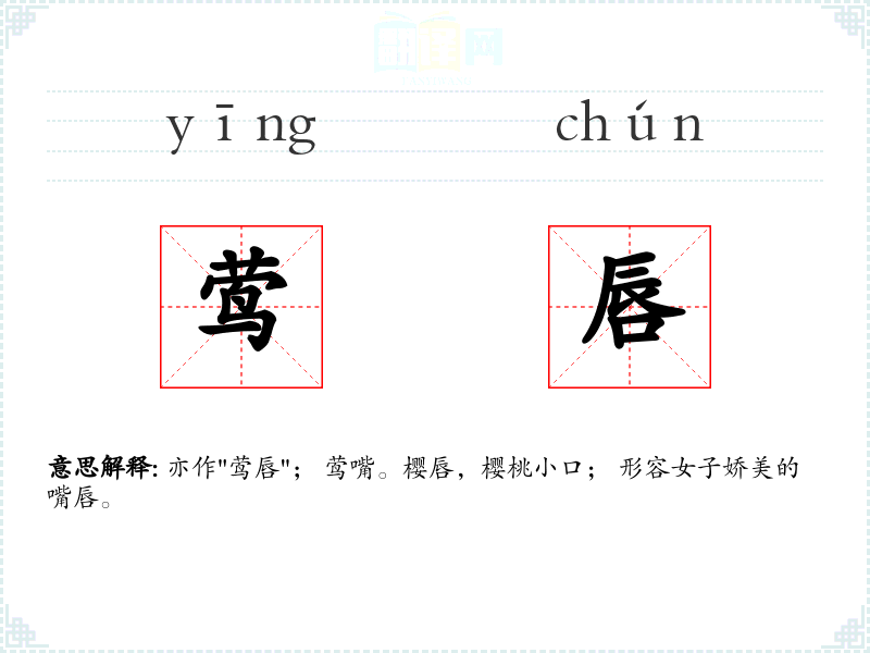 亦作"莺唇"; 莺嘴。樱唇,樱桃小口; 形容女子娇美的嘴唇。