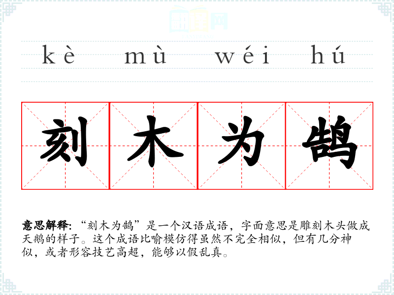 “刻木为鹄”是一个汉语成语,字面意思是雕刻木头做成天鹅的样子。这个成语比喻模仿得虽然不完全相似,但有几分神似,或者形容技艺高超,能够以假乱真。
