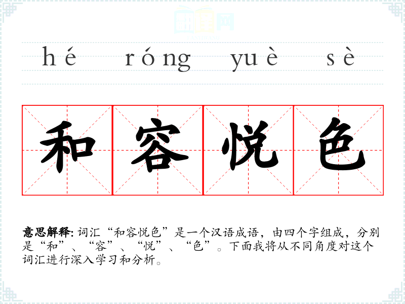 词汇“和容悦色”是一个汉语成语,由四个字组成,分别是“和”、“容”、“悦”、“色”。下面我将从不同角度对这个词汇进行深入学*和分析。