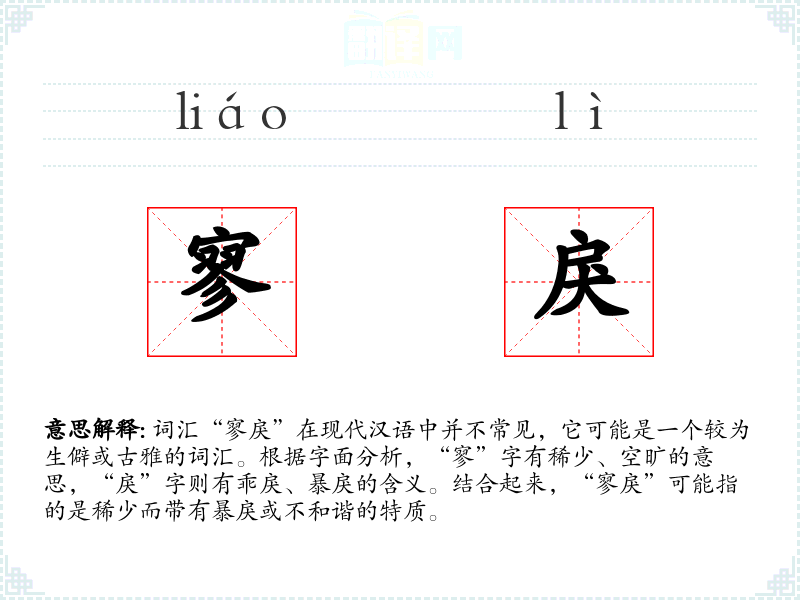 词汇“寥戾”在现代汉语中并不常见,它可能是一个较为生僻或古雅的词汇。根据字面分析,“寥”字有稀少、空旷的意思,“戾”字则有乖戾、暴戾的含义。结合起来,“寥戾”可能指的是稀少而带有暴戾或不和谐的特质。