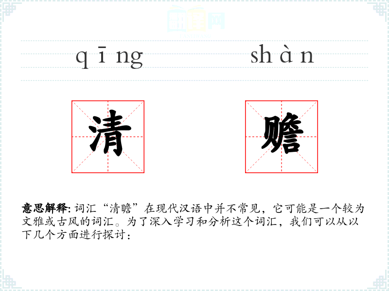 词汇“清瞻”在现代汉语中并不常见,它可能是一个较为文雅或古风的词汇。为了深入学习和分析这个词汇,我们可以从以下几个方面进行探讨: