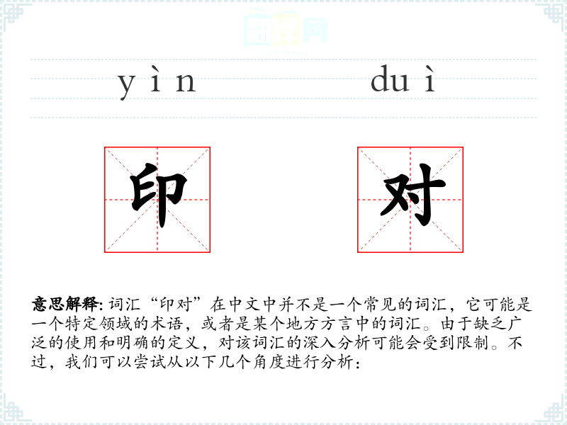 由于“印对”不是一个标准的中文词汇,对其的分析受到限制。在语言学*和表达中,了解和使用标准和常见的词汇更为重要。如果“印对”是一个特定领域的术语,了解其具体含义和用法对于该领域的专业人士是必要的。