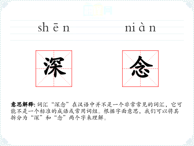 词汇“深念”在汉语中并不是一个非常常见的词汇,它可能不是一个标准的成语或常用词组。根据字面意思,我们可以将其拆分为“深”和“念”两个字来理解。
