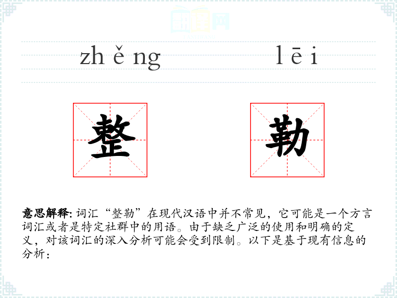 词汇“整勒”在现代汉语中并不常见,它可能是一个方言词汇或者是特定社群中的用语。由于缺乏广泛的使用和明确的定义,对该词汇的深入分析可能会受到限制。以下是基于现有信息的分析: