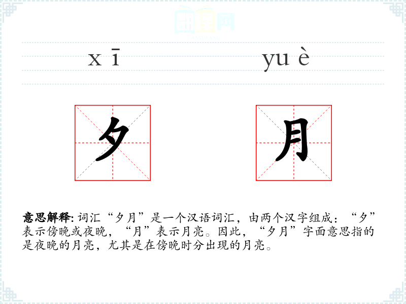 词汇“夕月”是一个汉语词汇,由两个汉字组成:“夕”表示傍晚或夜晚,“月”表示月亮。因此,“夕月”字面意思指的是夜晚的月亮,尤其是在傍晚时分出现的月亮。