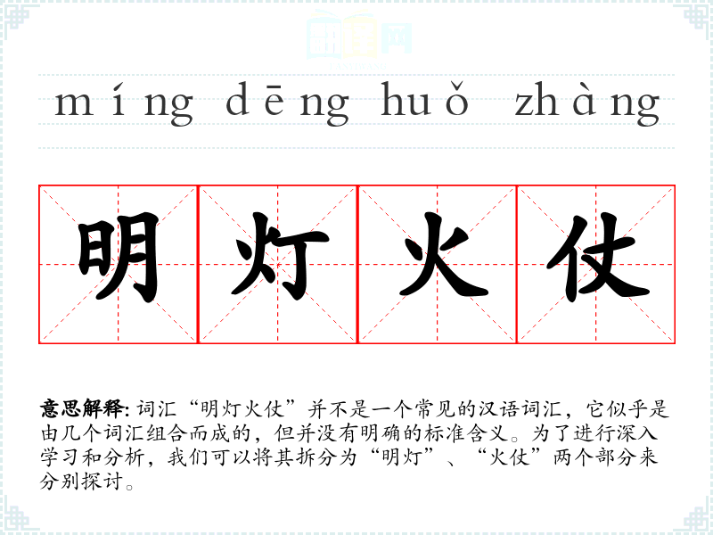 词汇“明灯火仗”并不是一个常见的汉语词汇,它似乎是由几个词汇组合而成的,但并没有明确的标准含义。为了进行深入学*和分析,我们可以将其拆分为“明灯”、“火仗”两个部分来分别探讨。