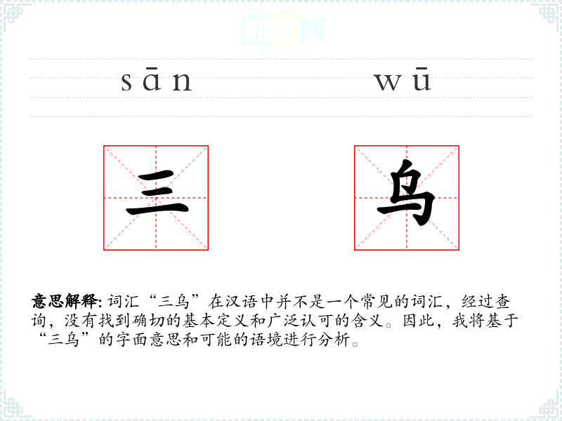 由于“三乌”不是一个常用词汇,它在不同语境下的使用非常有限。可能在一些特定的文学作品或地方方言中有所出现,但具体情况需要具体分析。