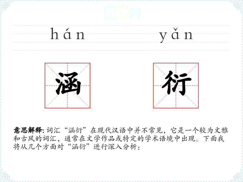 词汇“涵衍”在现代汉语中并不常见,它是一个较为文雅和古风的词汇,通常在文学作品或特定的学术语境中出现。下面我将从几个方面对“涵衍”进行深入分析: