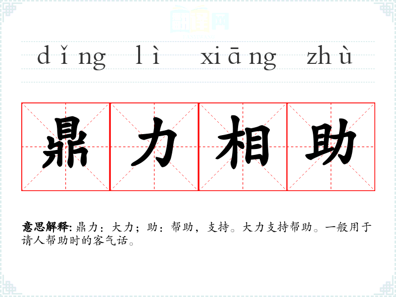 鼎力:大力;助:帮助,支持。大力支持帮助。一般用于请人帮助时的客气话。