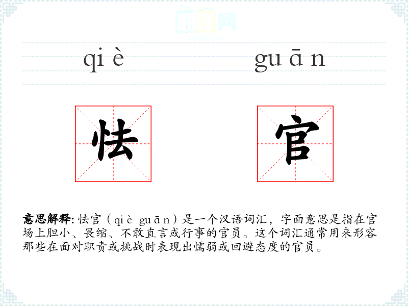 怯官(qiè guān)是一个汉语词汇,字面意思是指在官场上胆小、畏缩、不敢直言或行事的官员。这个词汇通常用来形容那些在面对职责或挑战时表现出懦弱或回避态度的官员。