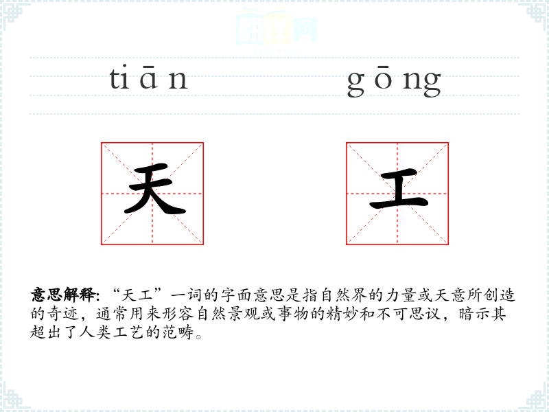 “天工”一词的字面意思是指自然界的力量或天意所创造的奇迹,通常用来形容自然景观或事物的精妙和不可思议,暗示其超出了人类工艺的范畴。