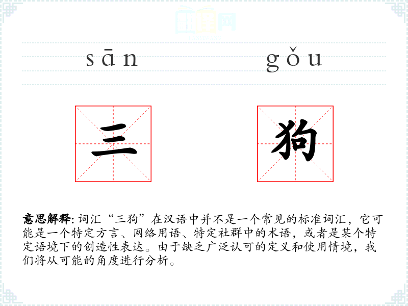 - 反义词:无特定反义词,因为“三狗”不是一个标准词汇。