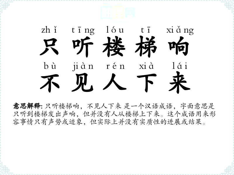 只听楼梯响,不见人下来 是一个汉语成语,字面意思是只听到楼梯发出声响,但并没有人从楼梯上下来。这个成语用来形容事情只有声势或迹象,但实际上并没有实质性的进展或结果。