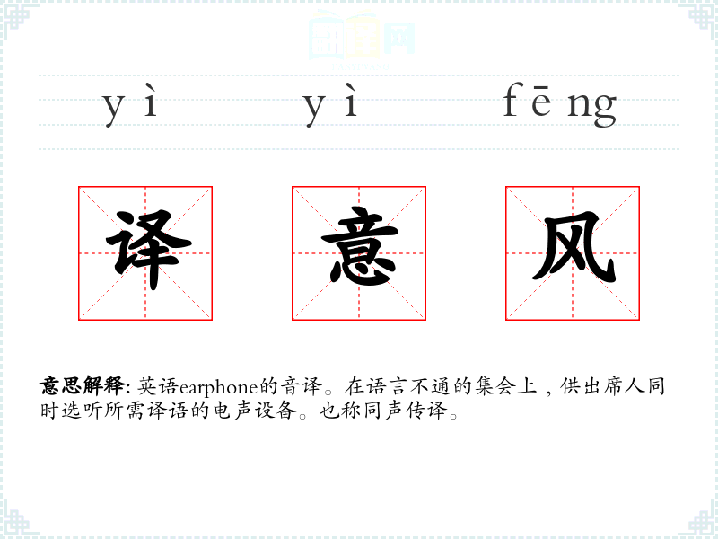 英语earphone的音译。在语言不通的集会上﹐供出席人同时选听所需译语的电声设备。也称同声传译。
