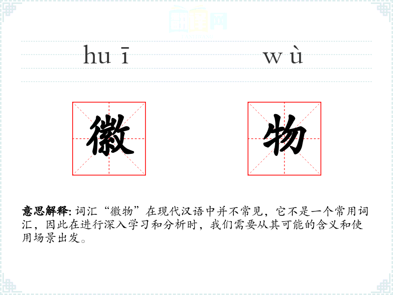 词汇“徽物”在现代汉语中并不常见,它不是一个常用词汇,因此在进行深入学*和分析时,我们需要从其可能的含义和使用场景出发。