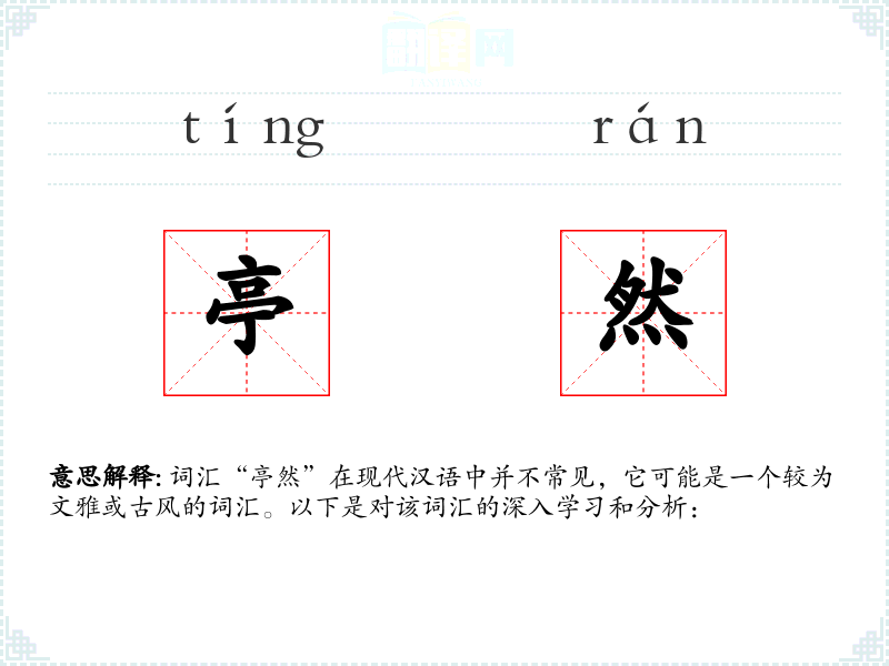 词汇“亭然”在现代汉语中并不常见,它可能是一个较为文雅或古风的词汇。以下是对该词汇的深入学*和分析: