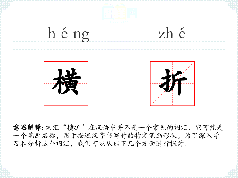 词汇“横折”在汉语中并不是一个常见的词汇,它可能是一个笔画名称,用于描述汉字书写时的特定笔画形状。为了深入学*和分析这个词汇,我们可以从以下几个方面进行探讨: