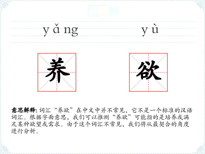词汇“养欲”在中文中并不常见,它不是一个标准的汉语词汇。根据字面意思,我们可以推测“养欲”可能指的是培养或满足某种欲望或需求。由于这个词汇不常见,我们将从最契合的角度进行分析。