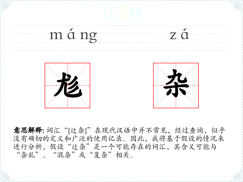 词汇“[辻杂]”在现代汉语中并不常见,经过查询,似乎没有确切的定义和广泛的使用记录。因此,我将基于假设的情况来进行分析,假设“辻杂”是一个可能存在的词汇,其含义可能与“杂乱”、“混杂”或“复杂”相关。