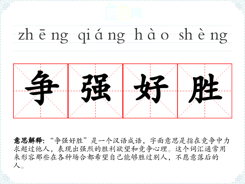 “争强好胜”是一个汉语成语,字面意思是指在竞争中力求超过他人,表现出强烈的胜利欲望和竞争心理。这个词汇通常用来形容那些在各种场合都希望自己能够胜过别人,不愿意落后的人。