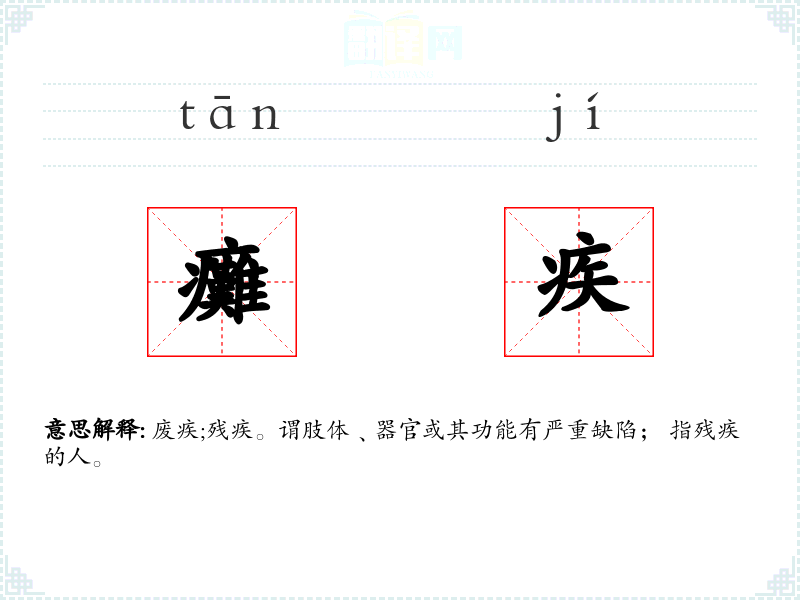 废疾;残疾。谓肢体﹑器官或其功能有严重缺陷; 指残疾的人。