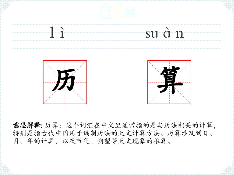 历算:这个词汇在中文里通常指的是与历法相关的计算,特别是指古代**用于编制历法的天文计算方法。历算涉及到日、月、年的计算,以及节气、朔望等天文现象的推算。